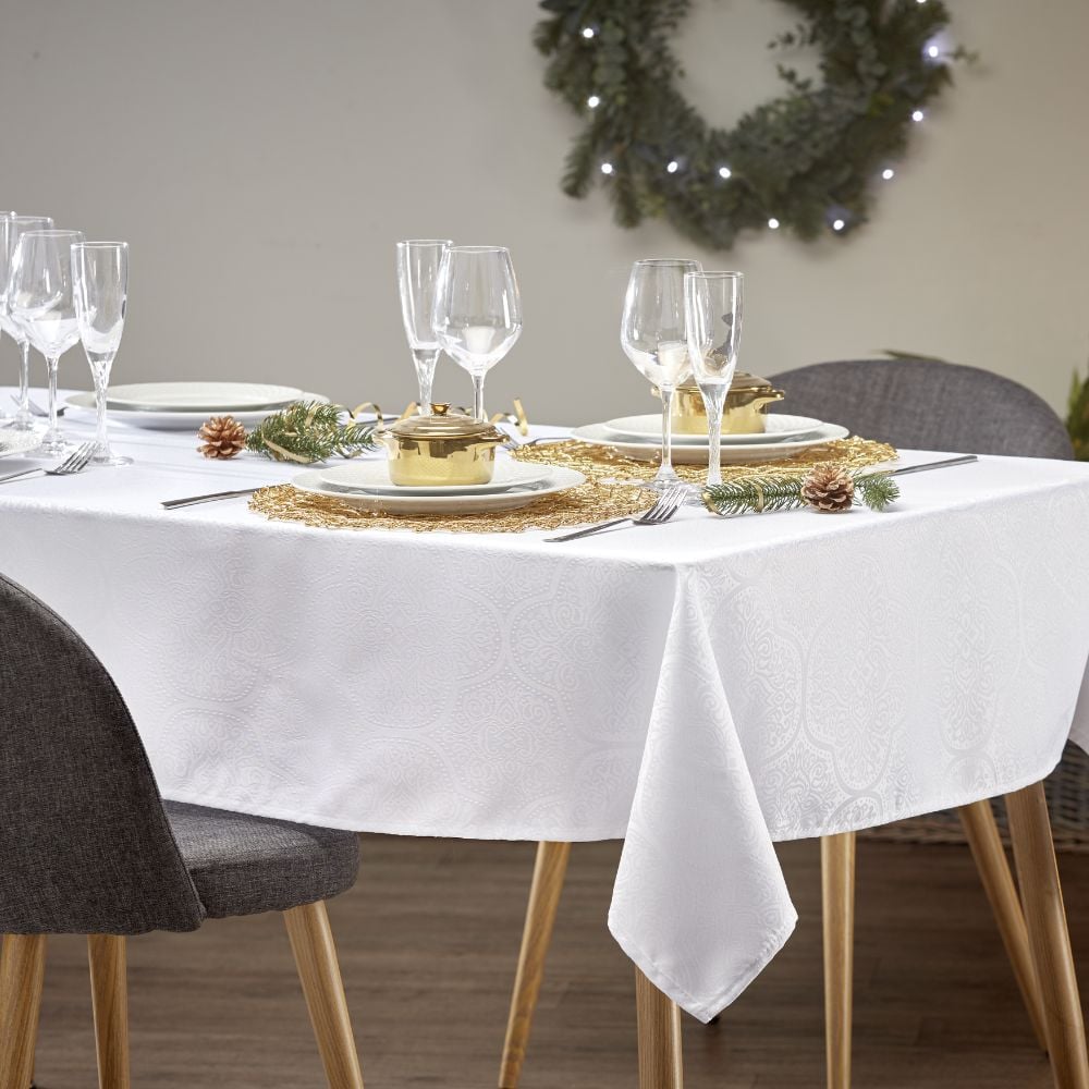 L'idée est de créer une table de Noël élégante et festive. En fonction du thème retenu, on choisira une nappe et un chemin de table dans les coloris choisis.