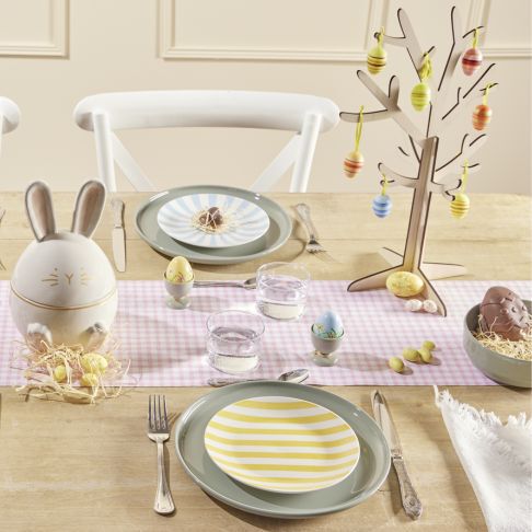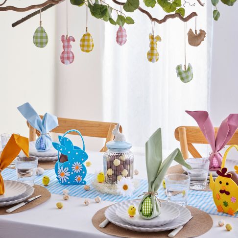 La serviette est un détail essentiel dans l’élaboration de votre décoration de table ! Que ce soit par ses couleurs, ses motifs ou sa présentation, elle ajoute une touche raffinée. Pour Pâques, optez pour un pliage original, comme celui en forme de lapin, un incontournable. Pour une touche encore plus personnalisée, n'hésitez pas à inscrire le prénom de chaque convive ou ses initiales sur la serviette en papier, en utilisant de la peinture et un pochoir. Laissez sécher avant de les disposer sur la table pour un effet réussi !