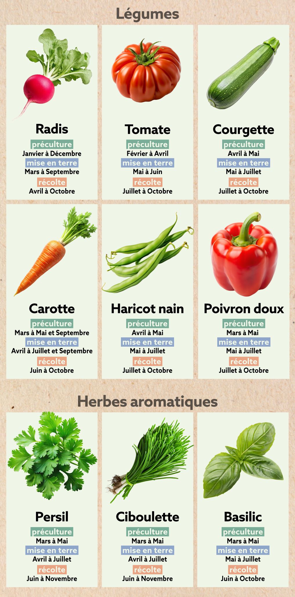 Suivez le calendrier des plantations pour savoir quand préparer vos semis, mettre en terre vos plans et prévoir vos récoltes