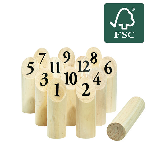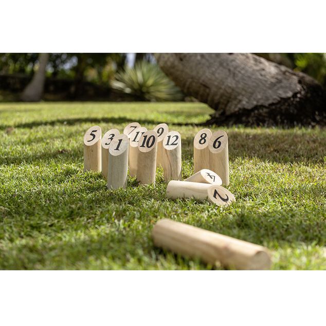 Ce jeu de plein air est composé de quilles numérotées et d'un lanceur en bois pour des parties conviviales.