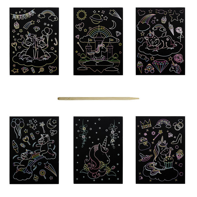 Lot de 6 feuilles à gratter thème licorne avec stylet en bois