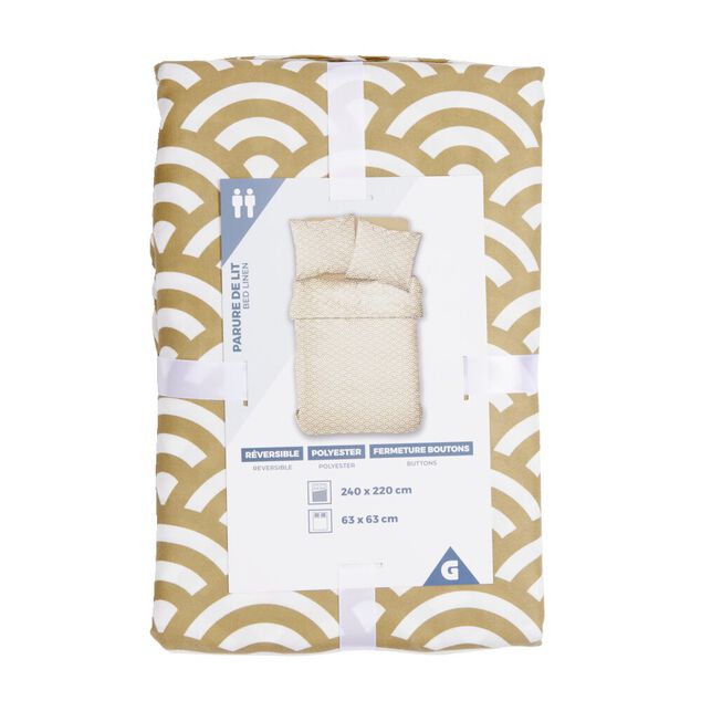 Parure de lit 2 personnes 240x220cm polyester motif vague japonaise marron et blanc