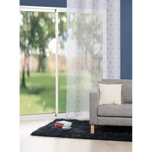 Voilage à oeillets blanc décor pompons rose 140x240 cm